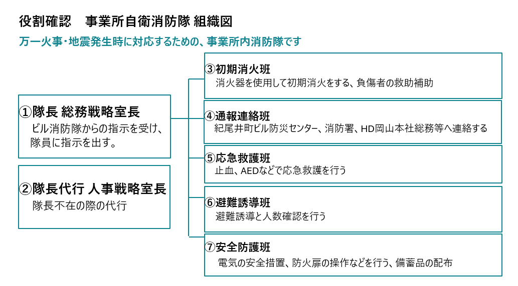 9月19日、紀尾井町オフィスでHLDGS総務の新入社員若林さんが主体となって、非常事態にも適切に対応できる体制の構築を目的とし、自衛消防隊の顔合わせを行いました。自衛消防隊とは、高層ビルなどにおいて火災、地震その他の災害等による被害を最小限に食い止めるために設置されるもので、災害発生時に先導して避難誘導を行います 。自衛消防隊の活動は日常的に意識しておけば対応できるものがほとんどであり、災害のリスクを大幅に抑えることができる利点がある一方で、紀尾井町オフィスではこれまで自衛消防隊の活用が不十分でした。自衛消防隊の役割が事業会社単位での分担のみで、個人の役割までは決まっておらず、災害発生時、マニュアル通りに十分な連携が取れないということが原因として考えられました。リスクマネジメントを担当している若林さんはそこに大きな課題を感じ、個人の役割を明確化し、すり合わせを行うことで、非常事態にも適切に対応できるような体制を構築するため、今回の顔合わせを企画しました。まずは事業会社単位の役割分担を個人にまで落とし込むため、下記を基準に5つの事業会社から選ばれた計19名を、隊長、副隊長、初期消火班、通報連絡班、応急救護班、避難誘導班、安全防護班に割り振りました。