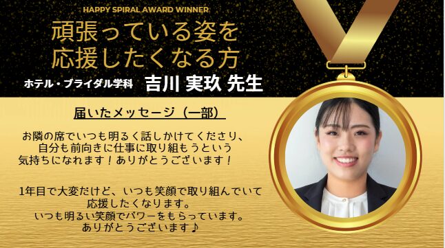 受賞者は、ホテル・ブライダル学科の吉川先生です!
