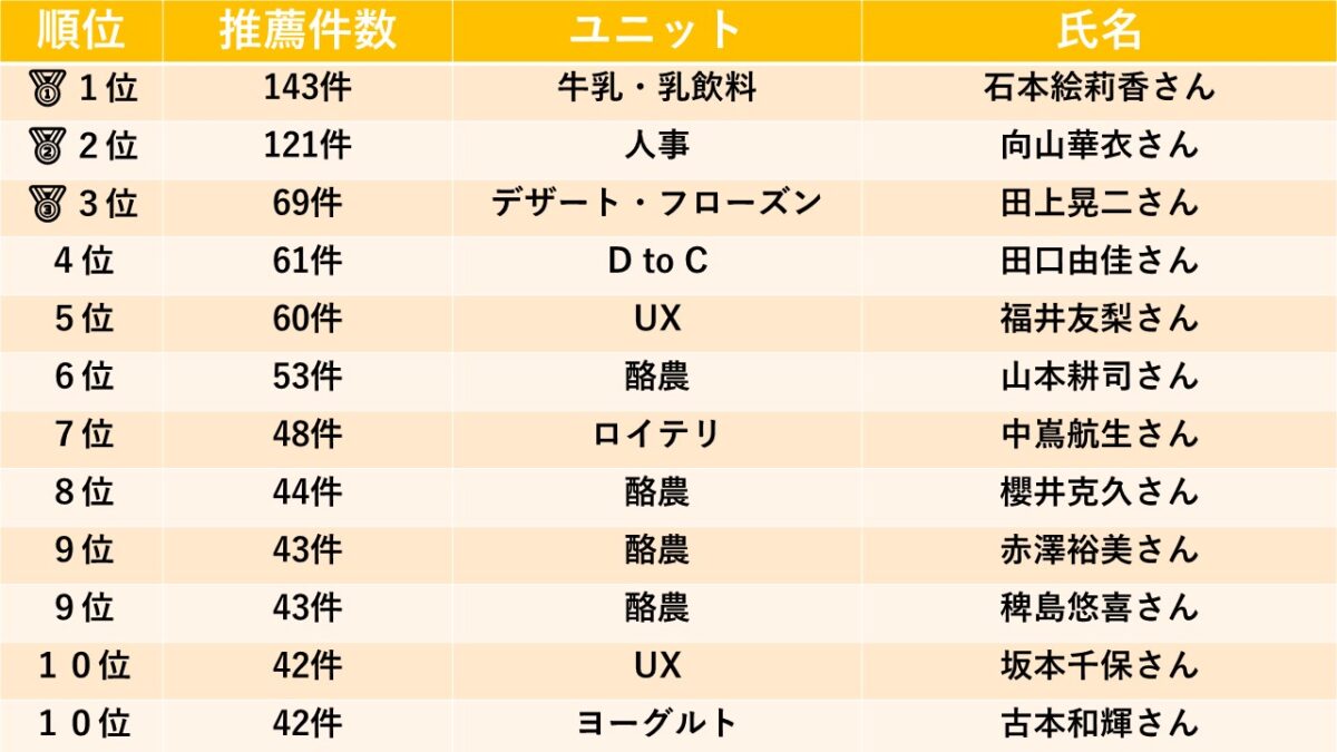 オハヨー乳業では『いいモノはいい』を実現するため、表彰制度を運用しています。 約1,000名のオハヨー社員が所属するユニットごとにチームに別れ、チーム単位で推薦を行っています。