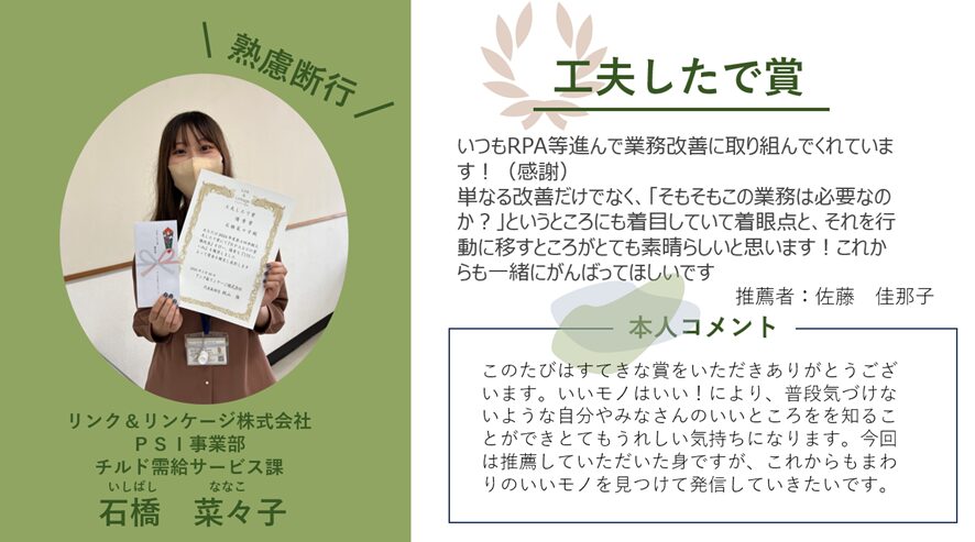いいモノはいいの活動を通して、今までは知る機会のなかった他部署の仲間の功績や努力を共有し、認め合い、高め合うことでリンク&リンケージのよりよい風土をつくっていけると認識しています。今回新しく『推進委員特別賞』を創設いたしましたが、この賞の創設目的として、得票数には表れない貢献度の高い『いいモノはいい行動』に対して表彰を行いL&Lのいいモノはいい文化を更に浸透させ各人が自発的に行動するモチベーションを上げることでより良い会社風土を構築することが狙いです。今までに見逃していた当たり前の『いいモノはいい』を見逃さないため、一つの尺度のみで当該行動をピックアップするのではなく違う角度でも表彰することでより多様な表彰ができればと考えています。