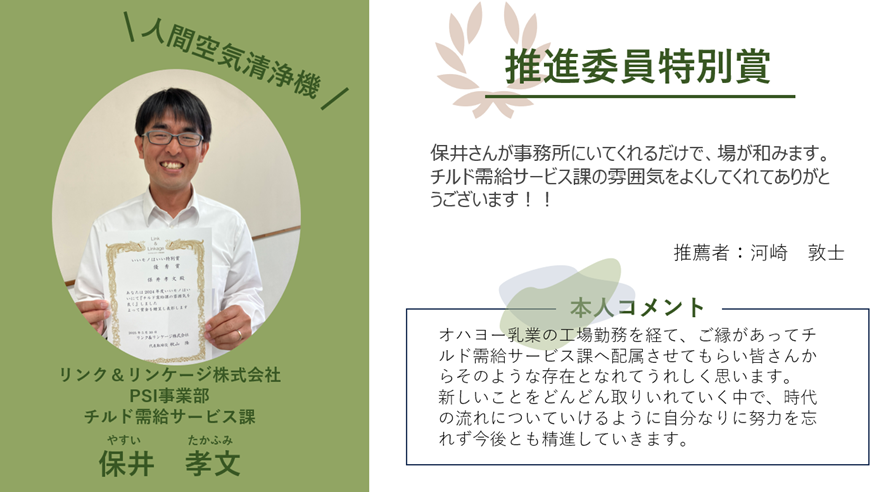 これまでリンク&リンケージでは3つの賞を設定しており、四半期ごとに推薦を集計し、たくさん「いいね!」を貰った行動を起こした人には優秀賞、その人を推薦した人には推薦賞を授与していました。今回から上記に加え、今回から得票数だけでなく内容に着目して「これは表彰すべきだ!」という推薦に対して新しく『推進委員特別賞』を設けていいモノはいいの受け皿を広くしました。
