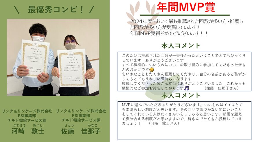 この4つの賞・年間MVP賞を通じて「ともに働く仲間同士『ありがとう』を伝え合う文化」を作り上げていきます。