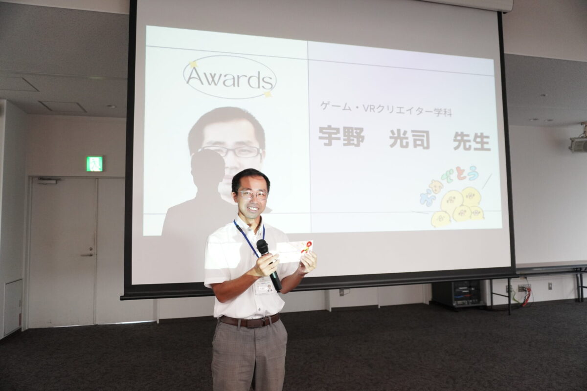 そんななか、仲間たちのステキポイントをより多く見つけた、ゲーム・VRクリエイター学科の【宇野光司先生】が“HAPPY SPIRAL AWARD”を受賞!