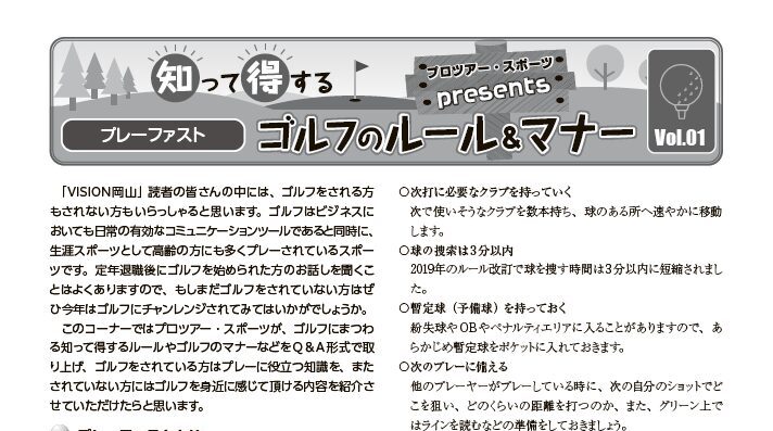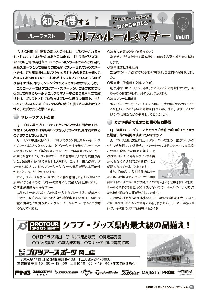 今回は1月26日号でスタートした新連載企画「知って得するゴルフのルール&マナー」を紹介します。同連載は、ゴルフ用品の販売・レンタル事業の㈱プロツアー・スポーツ(岡山市)がQ&A形式で紹介するもの。ゴルフをプレーする人にはより楽しくプレーするための役立つ情報として、まだプレーしていない人には身近に感じてもらい興味を持ってもらうきっかけとしてさまざまな情報を届ける企画です。
