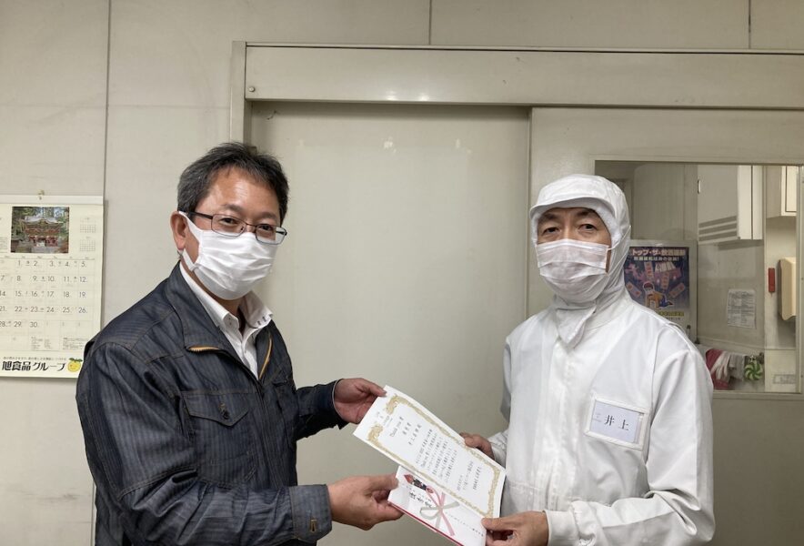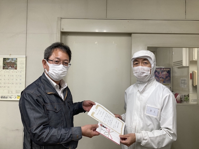 推薦賞:菱川 正弘さん→表彰されたのは、菊池 清純さん!入社前に自発的に受け、国家資格である運行管理者試験に合格した強者!仕事への熱意、入社後も周りに良い影響を与えている行動が評価されました。
