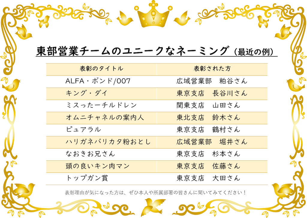 さて、オハヨーでは毎月、各チームのノミネート候補者を紹介するとき、推薦された方のお名前や推薦者のコメントだけでなく、その推薦理由を一言で表す「タイトル」をつけていますが、東京支店のネーミングはユニークです。