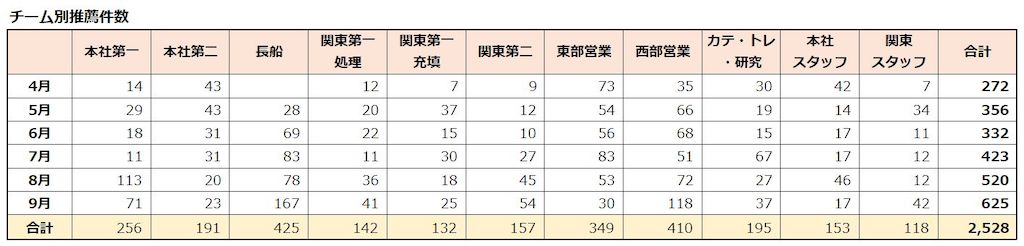 具体的には、オハヨー乳業全体を11チームに分けて推薦情報を収集。この際、推薦対象者はチームメンバーである必要はなく、他部署の方を推薦してもOKです。その中から、毎月20~30名程度をノミネート候補者として選出し、社内に発表しています。上半期(4月~9月)を振り返ってみると、この6ヶ月の間に2,500件以上の推薦が集まりました。しかも4月のスタート時と比較すると、毎月の推薦件数は増加傾向にあります。各自が業務を推進する中で、周りの人にも目が向くようになってきたと思います。