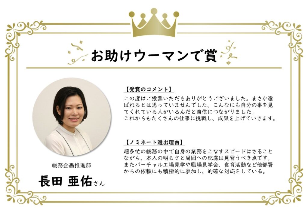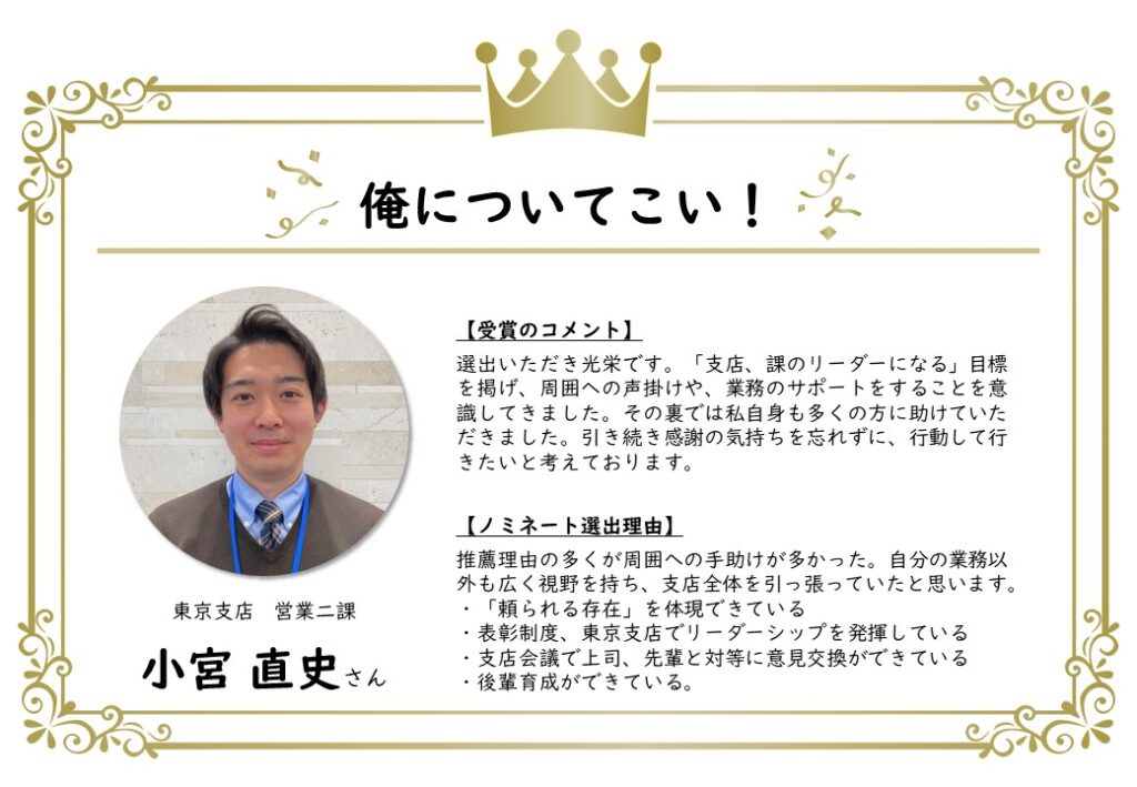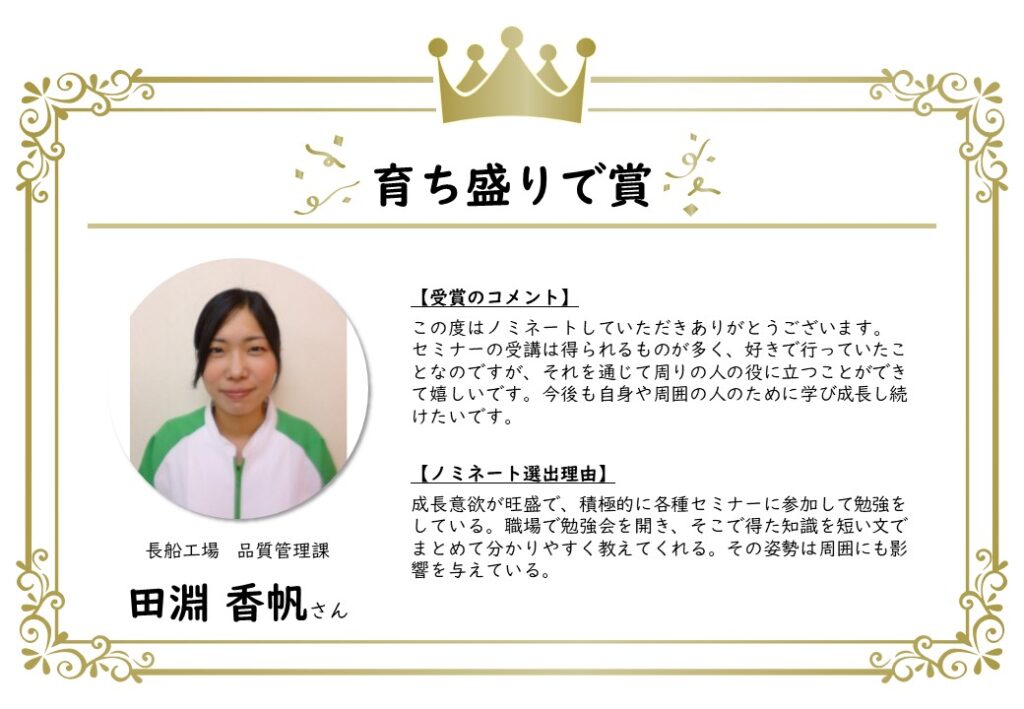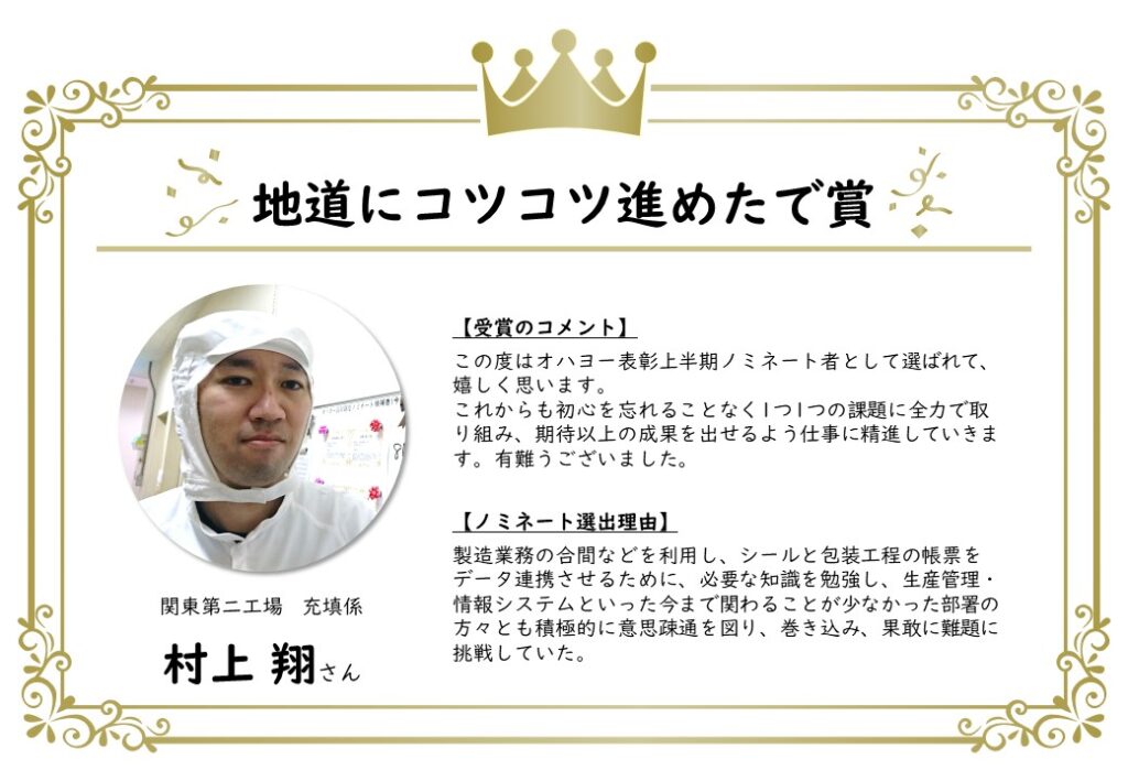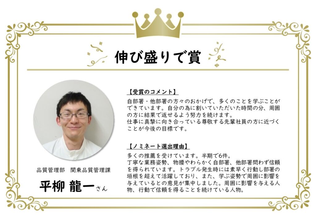 このたび、上半期のノミネート者が決定し、表彰されました。