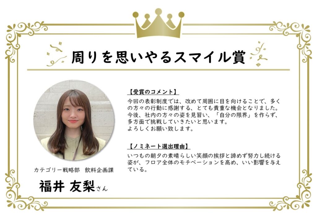 今回ノミネートされた方、Good推薦者に選ばれた方を含め、下期のノミネート者とMVPの方々を称える表彰式を春頃に対面で行い、素敵な賞品を贈呈する予定です。