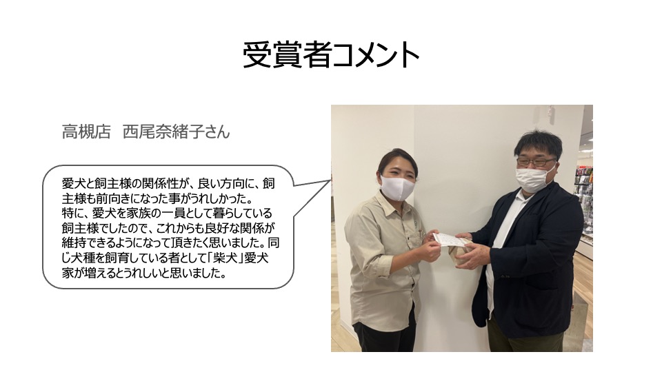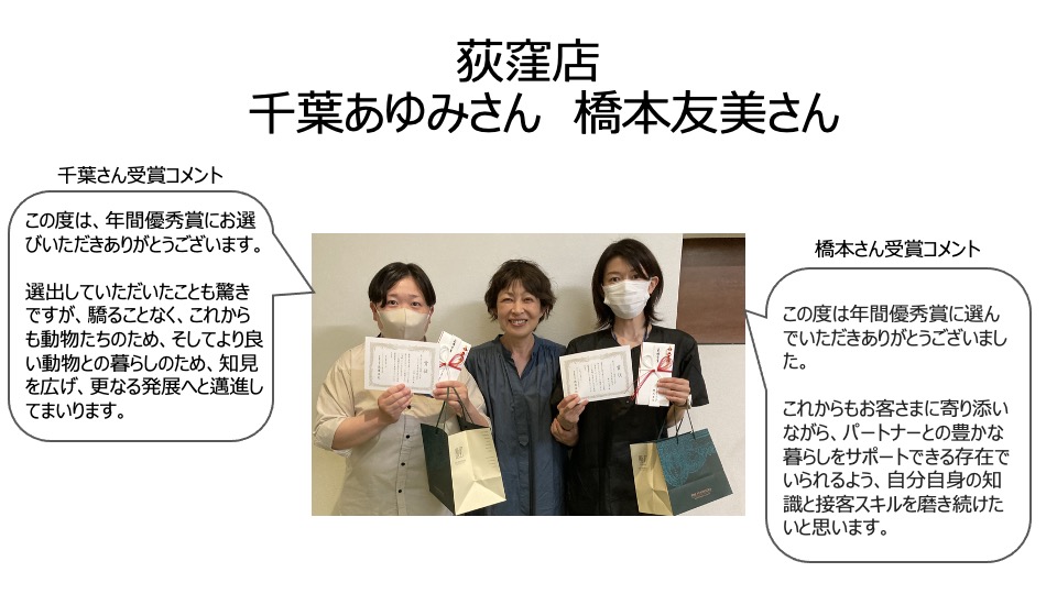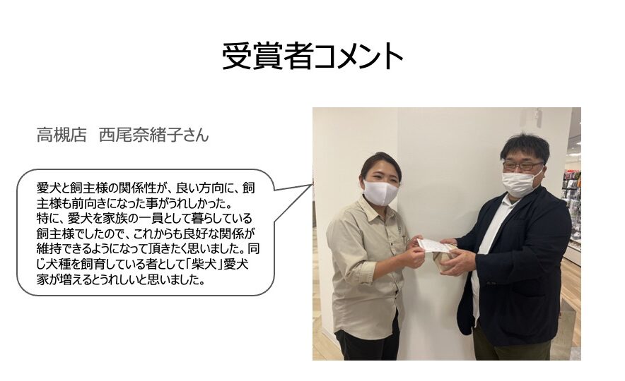 ライフパートナーイケダでは、「飼い主とペットに寄り添う存在になる」ことを価値として掲げており、その実現に向け、接客レベルを上げることを目的とした表彰制度「新たなイケダファン獲得したで賞」を運用しています。下期は個人での優秀賞以外にチームで新たなファンづくりができたということで、特別賞として高槻店一同を表彰いたしました。