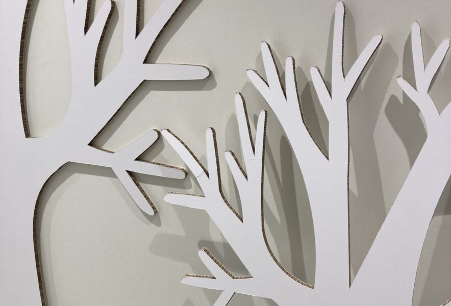 これまで木の印刷物を掲示しメモ帳のような物を貼り付けていましたが、スペースがいっぱいになったため、今回を機にベースと用紙を一新しNSKのリボードを使った立体的な木を作りメモも葉っぱの形を模した用紙に変更しました。